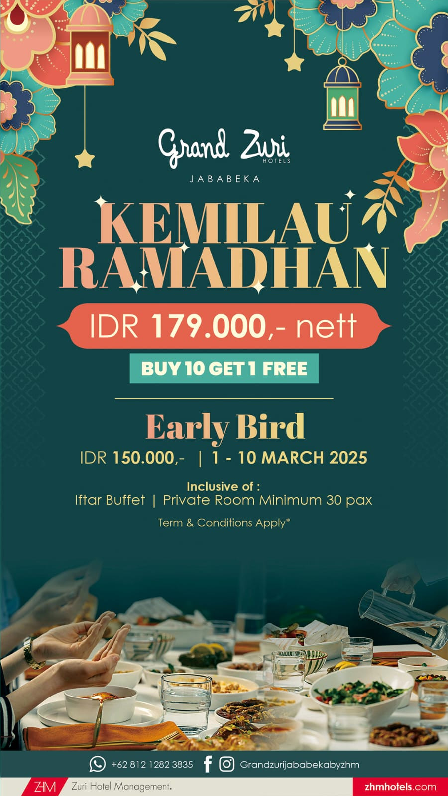 Bulan suci Ramadhan menjadi momen istimewa yang dinantikan umat Muslim di seluruh dunia. Dalam menyambut bulan penuh berkah ini, Grand Zuri Jababeka Hotel menghadirkan promo spesial "Kemilau Ramadhan" dengan penawaran menarik seharga Rp179.000 nett per orang, serta promo beli 10 gratis 1.